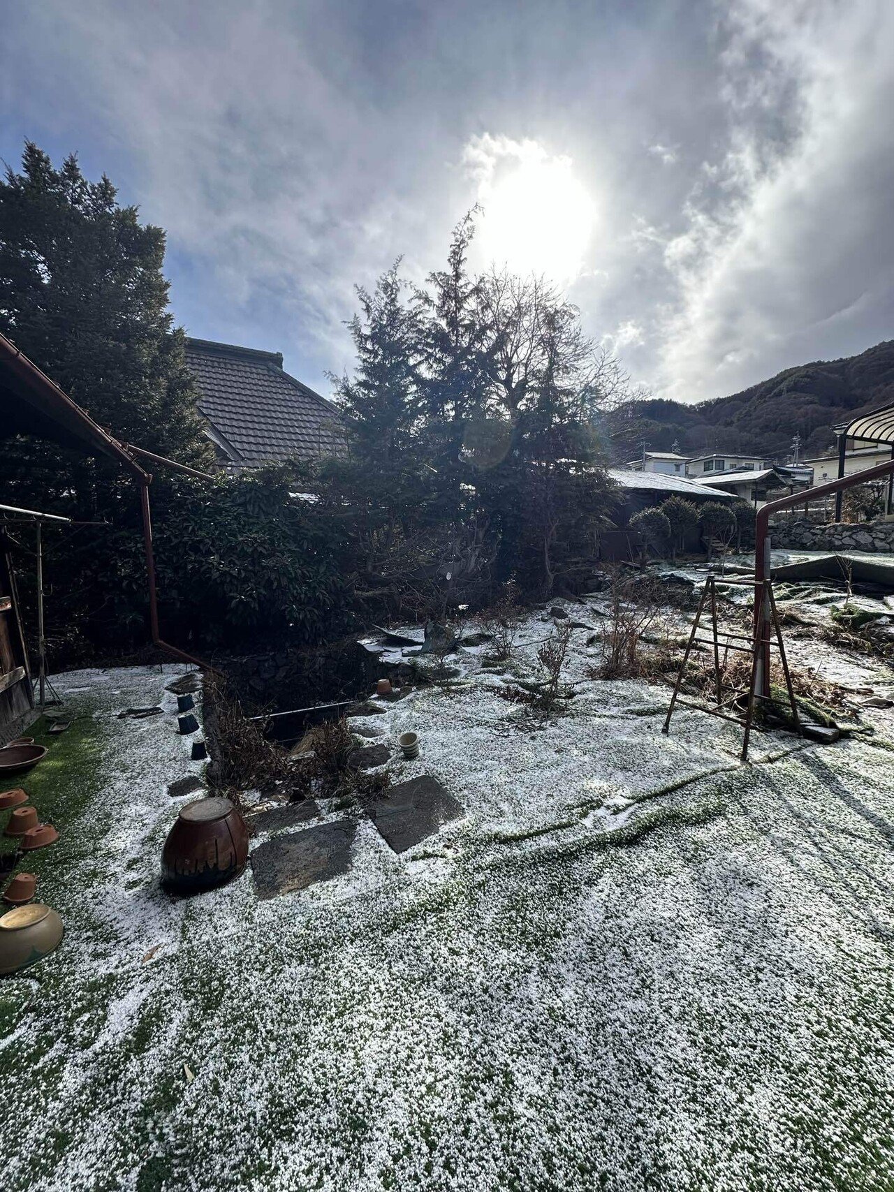 庭を見ると昨夜の強風で畑の防草シートと人工芝が1箇所だけめくれている。