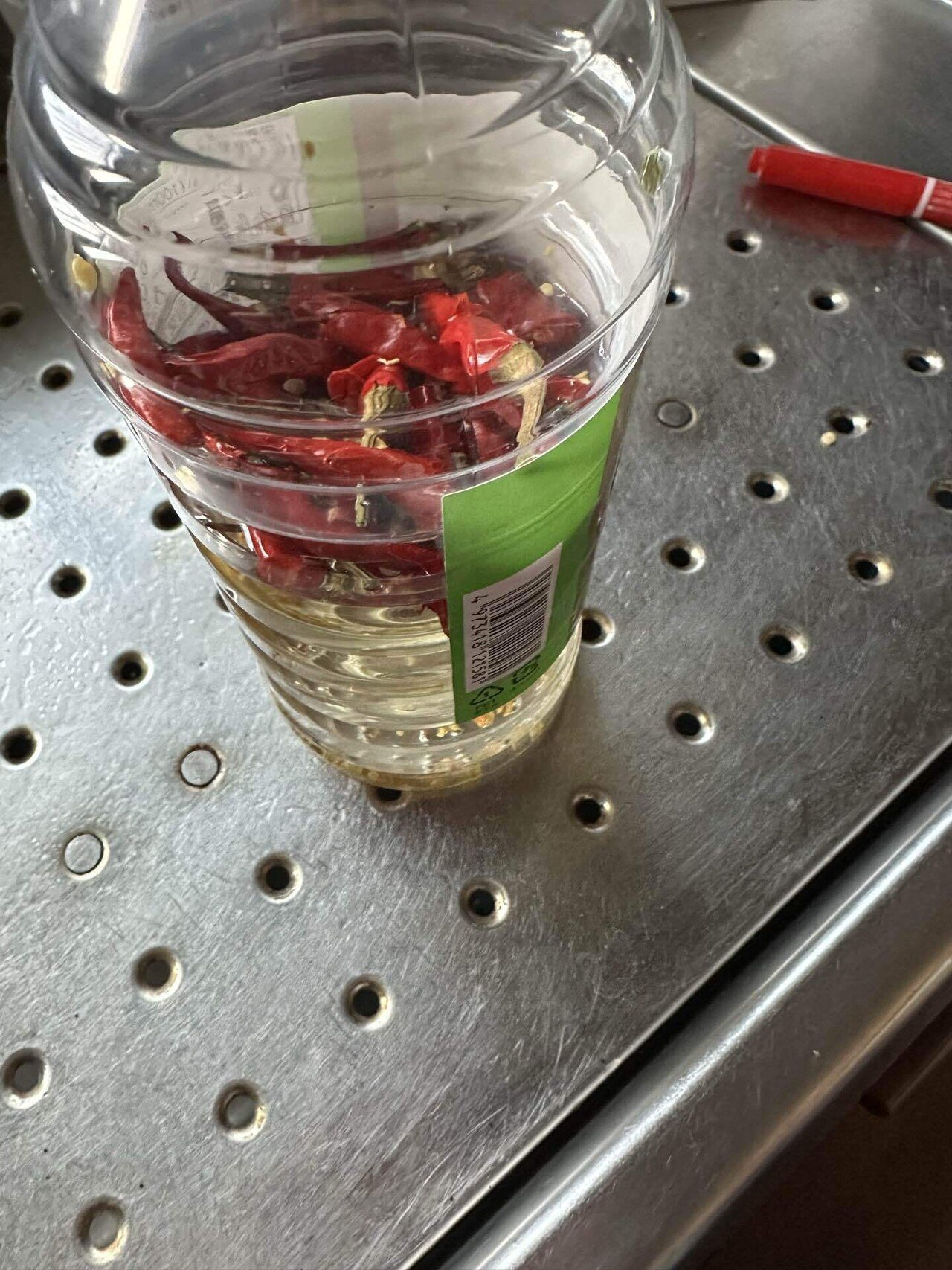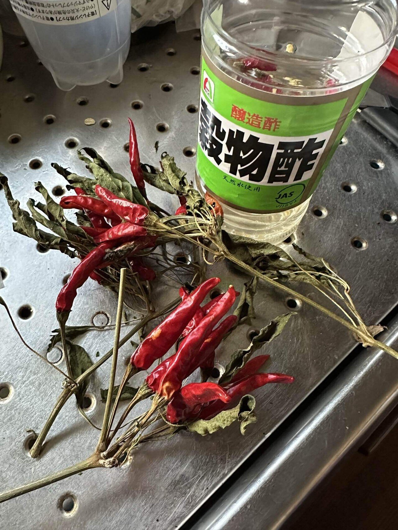 畑で育てて干しておいた唐辛子をダイソー様の酢に漬けました。